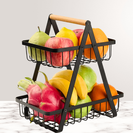 Cos pentru Fructe, 2 Niveluri, Maner de Lemn, Usor de Instalat, din Metal, Negru