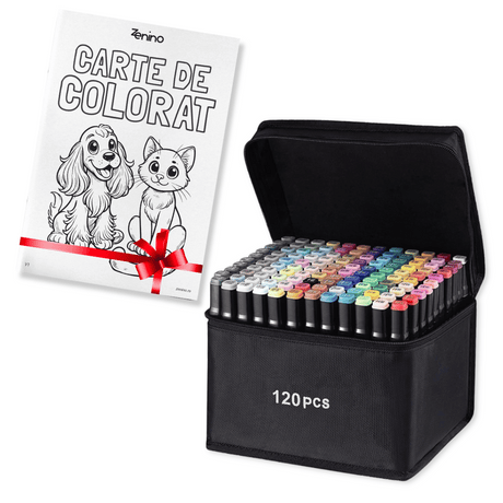 Set Markere + Carte de Colorat CADOU, Varf Dublu, Culori Intense, Geanta de Depozitare, Multicolor