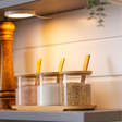 Setul contine 3 recipiente din sticla, concepute pentru depozitarea eficienta a condimentelor, ierburilor uscate sau pudrelor alimentare.